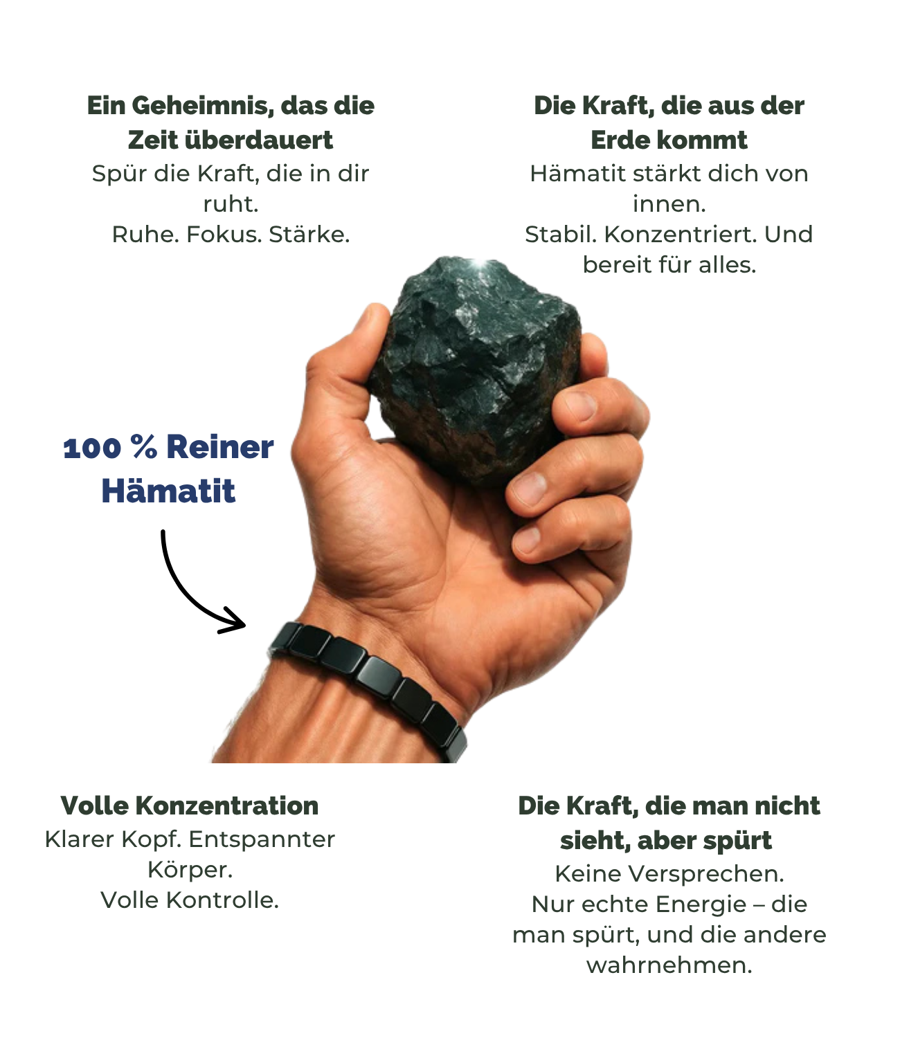 Nur die reine magnetische Kraft des Hämatits, täglich getragen wie ein Ritual, um einen klaren Geist, stabile Energie und tiefes Vertrauen wiederzufinden.